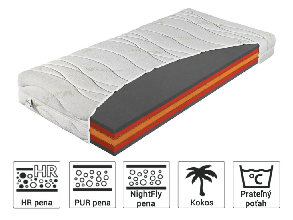 Materiálové zloženie: PUR pena, NightFly pena, kokos, studená HR pena, poťah