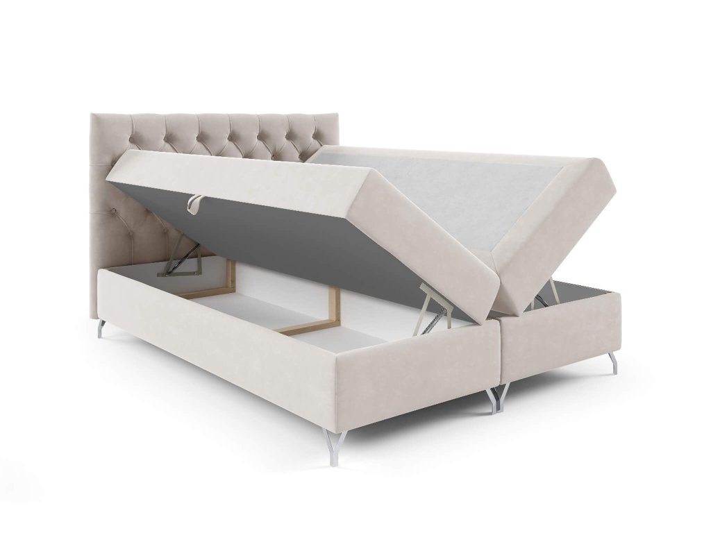 Doprajte si komfort na sivej jednolôžkovej boxspringovej posteli Guliette, ktorá štýlovo doplní každú spálňu. Luxusný vzhľad postele dotvárajú kovové nožičky a úložný priestor, ktorý sa otvára pružinovým systémom z bočnej strany. Posteľ je vybavená matracom s pružinami Bonell a vysokoelastickou penou T30, čo zaručuje pohodlný spánok. Vrchný matrac (Topper) z elastickej peny reguluje teplotu a reaguje na každý pohyb, poskytujúc dodatočnú mäkkosť. Poťah je odnímateľný a prateľný na 30 °C. Prepracované čelo postele je prešívané a doplnené gombíkmi, ideálne pre čítanie alebo pozeranie TV. Matrac nie je celočalúnený a vrchná látka matraca nie je v rovnakej farbe ako posteľ. Posteľ je čalúnená látkou Magic Velvet 2240, ktorá je mäkká, zamatová a odolná proti oderu. Svetlosivá farba dodá vašej spálni eleganciu.