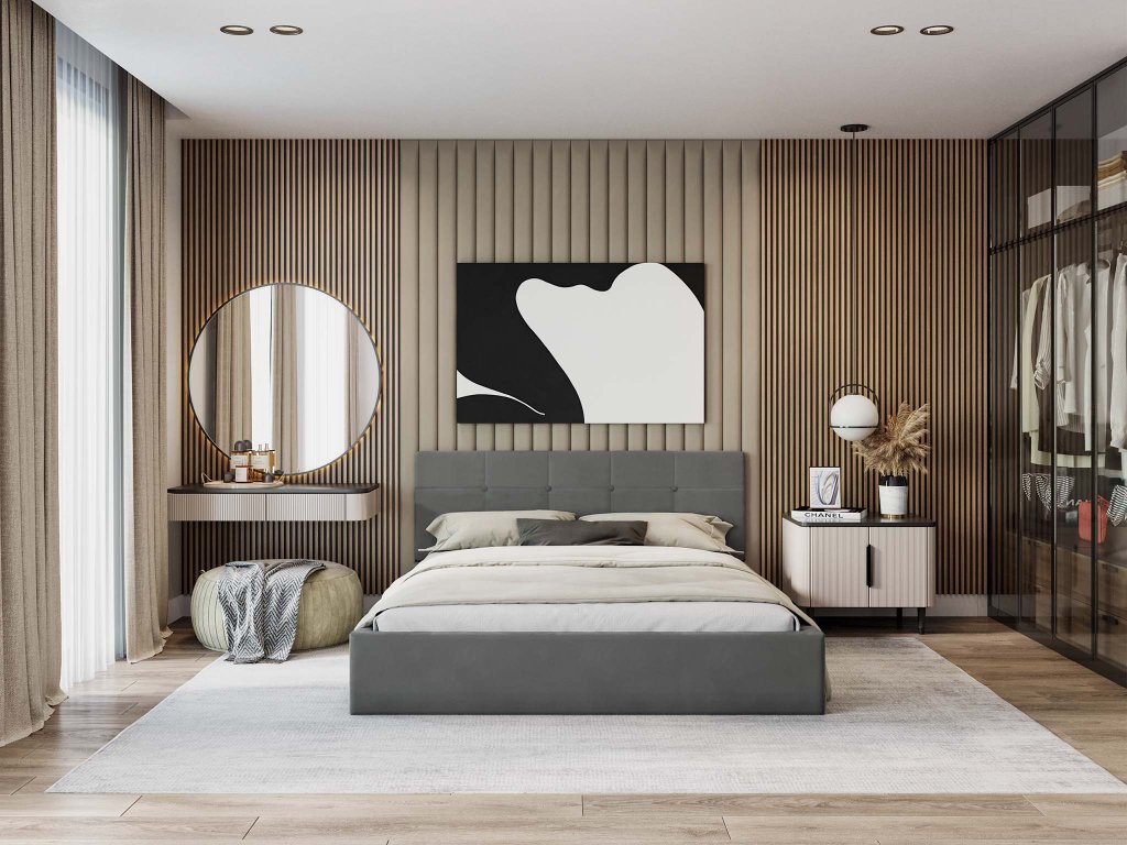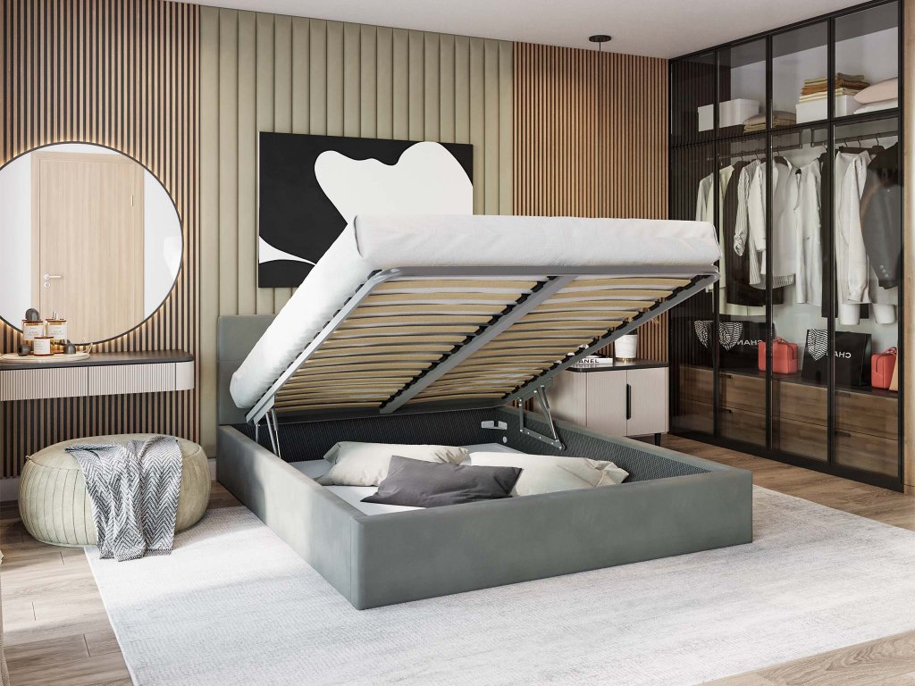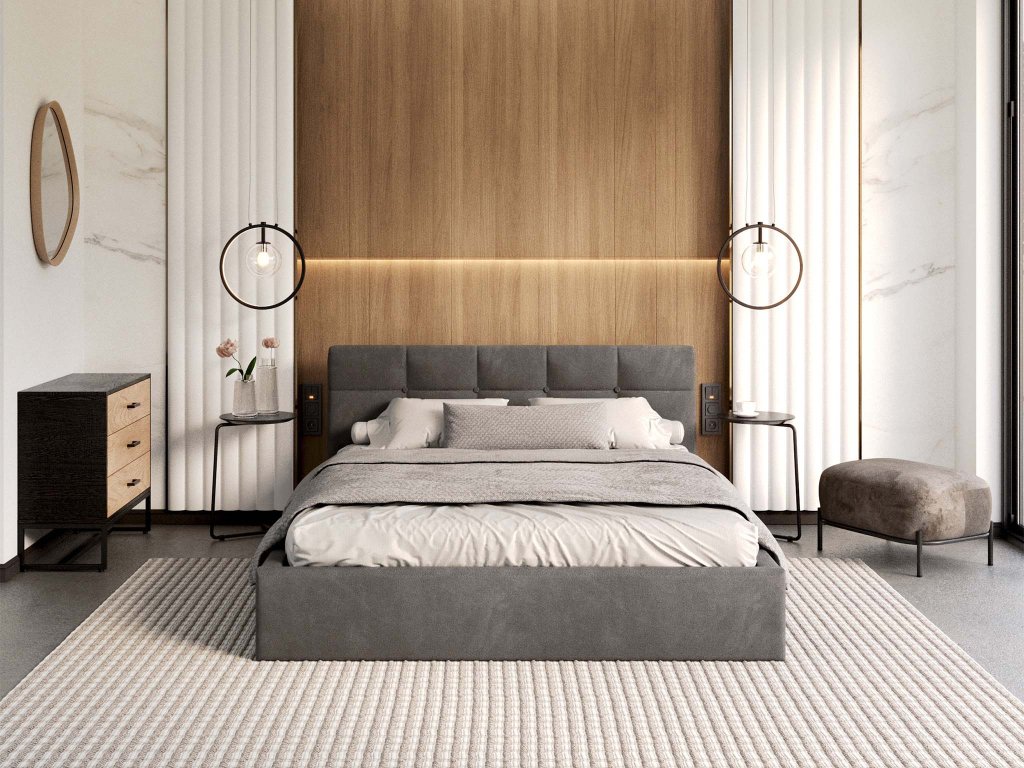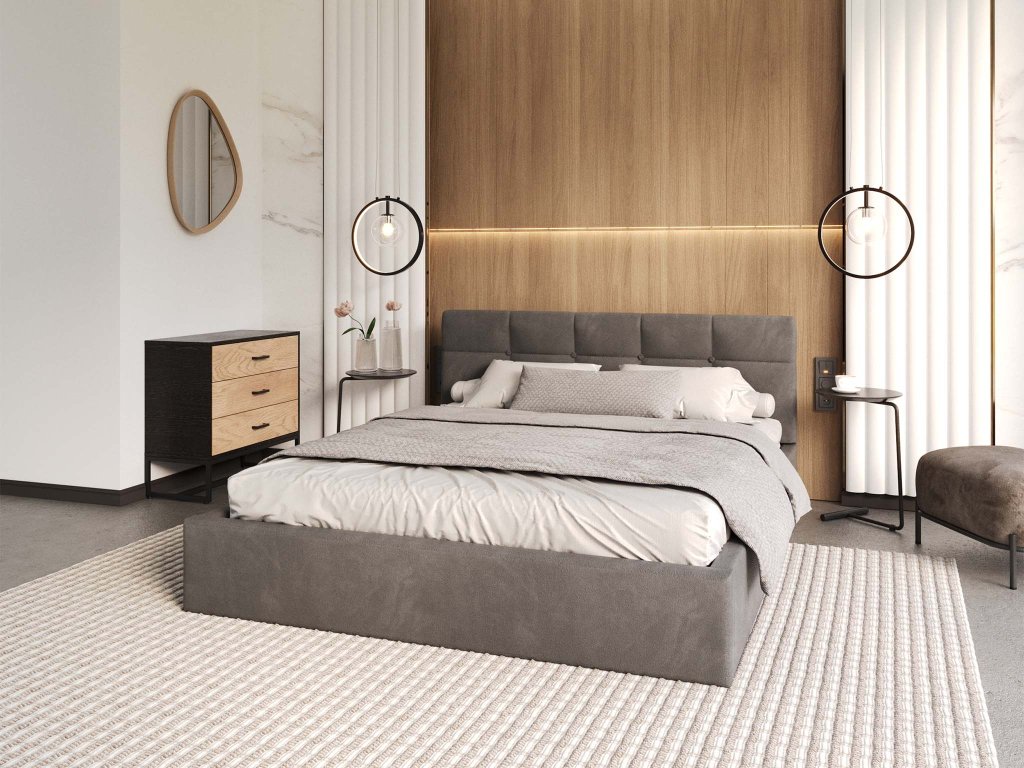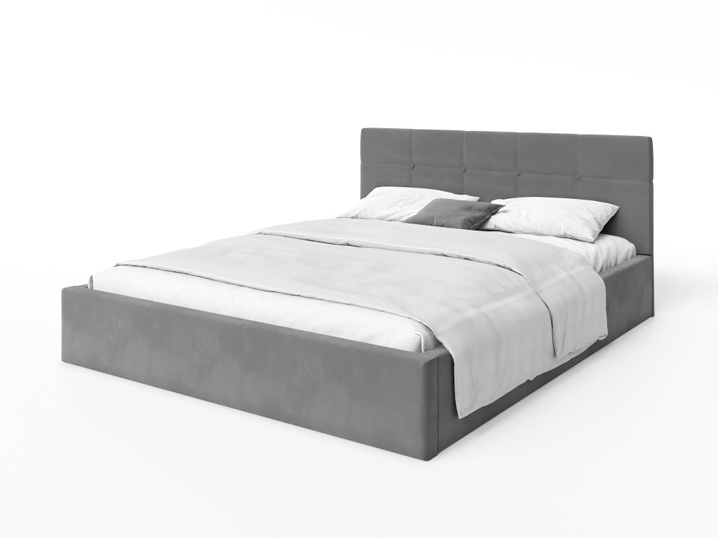 Sivá čalúnená manželská posteľ s vysokým čelom, poskytne výbornú podporu pre chrbát pri čítaní kníh. Výhodou postele je stabilita, veľký úložný priestor a žiarivá látka. Posteľ je čalúnená velúrom s moderným vzhľadom, ktorý je veľmi jemný a príjemný na dotyk, odolný voči žmolkovaniu. Posteľ má kovový rám s pružnými brezovými lištami, ktoré sa prispôsobia tlaku. Na dvíhanie roštu v posteli, sú využívané dva plynové piesty o sile 400N až 1000N /ks, v závislosti od rozmeru postele.