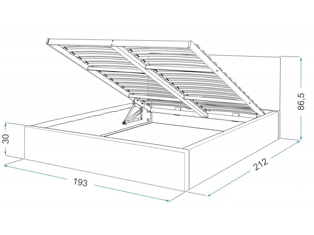 Manželská posteľ s vysokým čalúneným čelom poskytuje výbornú podporu pre chrbát pri čítaní kníh. Výhodou postele je veľký úložný priestor, napríklad na posteľnú bielizeň. Posteľ je čalúnená velúrom s moderným vzhľadom, ktorý je veľmi jemný a príjemný na dotyk, odolný voči žmolkovaniu. Posteľ má kovový rám s pružnými brezovými lištami, ktoré sa prispôsobia tlaku tela. Na dvíhanie roštu v posteli, sú využívané dva plynové piesty o sile 400N až 1000N /ks, v závislosti od rozmeru postele.