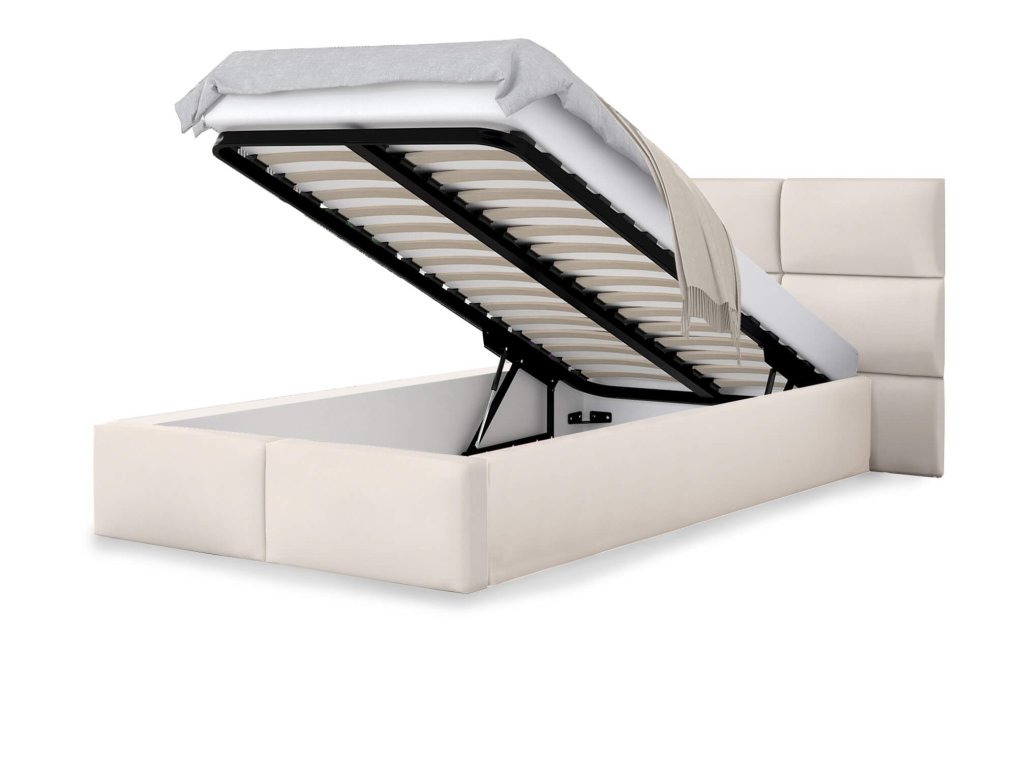 Krémová posteľ Dony 120x200 - spojenie moderného štýlu s funkčnosťou. Vychutnajte si pohodlie mäkkého čalúneného čela a praktický úložný priestor, ku ktorému sa dostanete vyklopením lamelového roštu v kovovom ráme. Kvalitné materiály a pevná konštrukcia zaručujú trvalú stabilitu a odolnosť. Látka Trinity zaisťuje príjemný pocit pri zostupovaní z postele. Uschovajte si lôžkoviny po ruke vďaka priestrannému úložnému priestoru pod roštom, ktorý sa dá jednoducho vyklopiť pomocou dvoch plynových piestov. Špeciálne skrutky s veľkým priemerom a dodatočný výstužný spoj zabezpečujú stabilné spojenie jednotlivých častí postele.