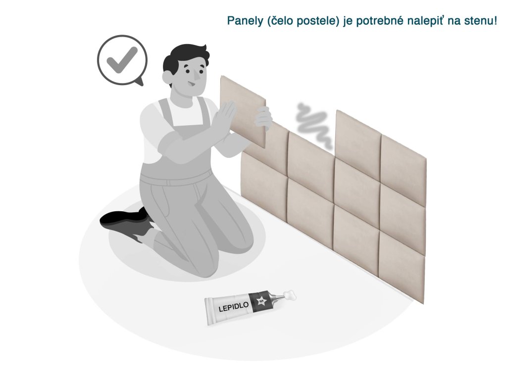 Posteľ sa skladá z čela a rámu postele. Čelo postele obsahuje 9 čalúnených panelov, ktoré si je pri montáži potrebné nalepiť na stenu.