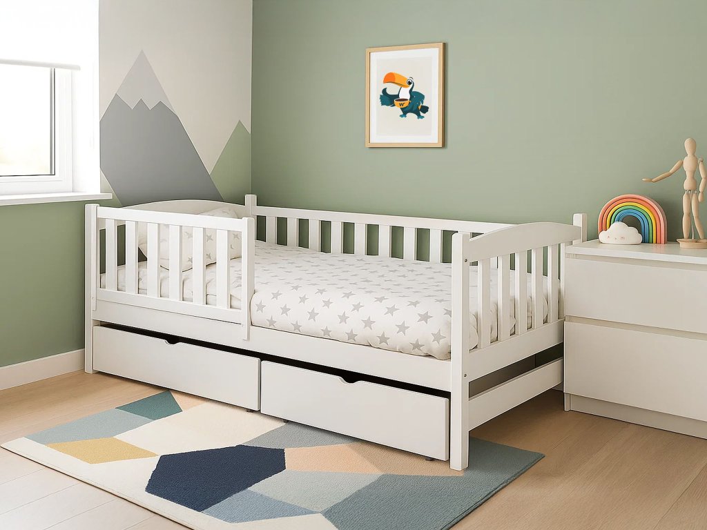 Drevená posteľ Oľga 2 v bielej farbe je vyrobená z kvalitného masívu borovice. Je ošetrená bezfarebným ekologickým lakom a vďaka použitým materiálnom je posteľ stabilná. Súčasťou postele je bezpečnostná bariérka, ktorá ochráni Vaše dieťatko pred nepríjemným pádom z postele. Zároveň je odnímateľná, preto ju v prípade potreby jednoducho odmontujete. Bariéru môžete namontovať na ktorúkoľvek stranu postele, podľa vašej potreby. Manipulácia s úložnými boxami je veľmi jednoduchá, pretože nie sú nijako upevnené k posteli.