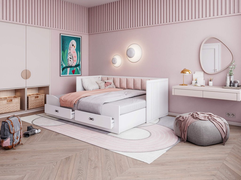 Naša rozkladacia posteľ Hermes je štýlovým a elegantným doplnkom do dievčenských izieb, a vďaka vyrobeniu z kvalitnej MDF dosky s ABS hranami, zaručuje pohodlný spánok a štýlový dizajn pre Vašu izbu. Táto posteľ je nielen praktická, ale aj vytrvalá a pevná s jej stabilnou konštrukciou, čo zabezpečuje bezpečnosť Vašich detí. Výhodou tejto postele je aj jej úložný priestor, ktorý môžete využiť na uskladnenie posteľnej bielizne či hračiek, udržujúc Vašu izbu upratanú a organizovanú. Rozkladacia posteľ sa ľahko premení na pohodlné dvojlôžko s rozmermi 154x200 cm, čo je ideálne pre hostí. S nosnosťou až 200 kg a plnou dĺžkou 200 cm je naša posteľ ideálna pre pohodlný spánok až dvoch detí alebo dospelých. Vďaka jej praktickému dizajnu môžete posteľ využiť aj ako pohovku v kombinácii s dekoračnými ružovými panelmi. Táto všestranná posteľ je skvelou voľbou pre súrodencov alebo pre príležitostné návštevy vašich detí. Ak chcete posteľ využívať aj ako pohovku, odporúčame ju chrániť vhodným poťahom, prehozom alebo dekou počas dňa. Praktická a štýlová posteľ Hermes je ideálna pre malé detské izby, garsónky ale aj chaty. Vložte do svojho domova kvalitu, pohodlie a štýlový dizajn s našou rozkladacou posteľou Hermes. Investujte do vytrvalej a praktickej postele, ktorá Vám poskytne nielen pohodlný spánok, ale aj skvelý nábytok pre Vašu izbu. Nechajte sa okúzliť jej eleganciou a využite jej úložný priestor na udržanie vašej izby v poriadku.