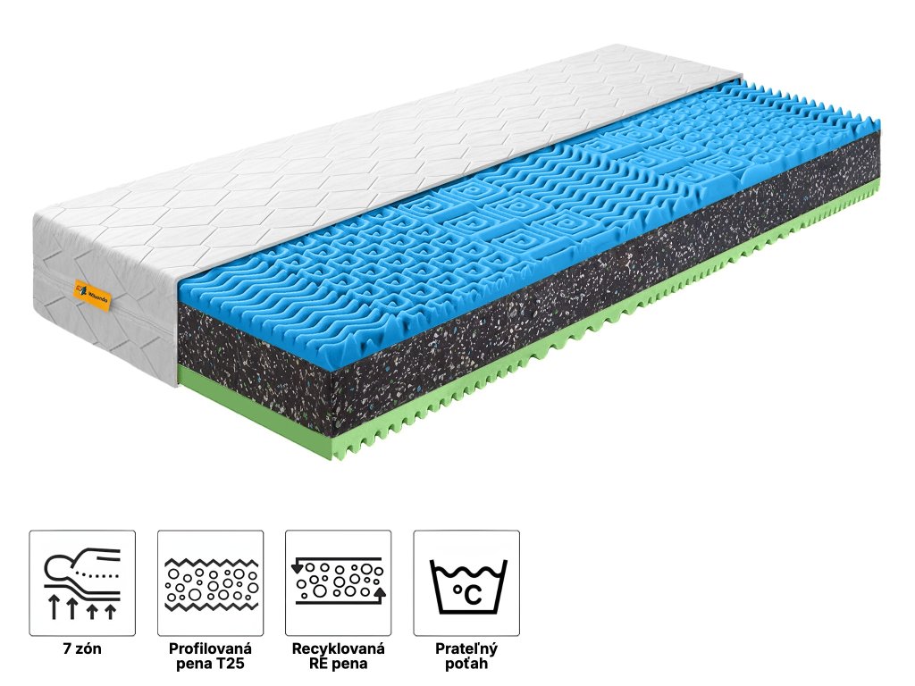 Materiálové zloženie: Profilovaná polyuretánová pena T25, Recyklovaná RE pena, Poťah Jersey