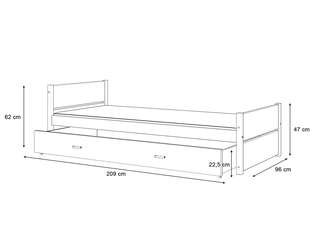 Posteľ 90x200 pre deti i tínedžerov DANTE spája odolnosť a pevnosť so zaujímavým dizajnom. Všetky hračky, deky, sezónne oblečenie či posteľnú bielizeň hravo uschová úložný box na kolieskach. Posteľ je vyrobená z kvalitnej a odolnej MDF dosky. Tá sa navyše ľahko udržiava a čistí. Spojenie postele kladivovými skrutkami zaručuje vysokú pevnosť a stabilitu postele.Nohy postele sú z masívu. Vďaka jej štýlovému dizajnu ju môžete použiť v rôznych interiéroch detskej, študentskej či hosťovskej izby. Flexibilný lamelový rošt vyrobený z kvalitného masívneho dreva poskytuje maximálne pohodlie počas spánku, nakoľko zvyšuje pružnosť a komfort matraca. Posteľ je ošetrená lakom na vodnej báze, ktorý je bez zápachu a je bezpečný pre detské výrobky.
