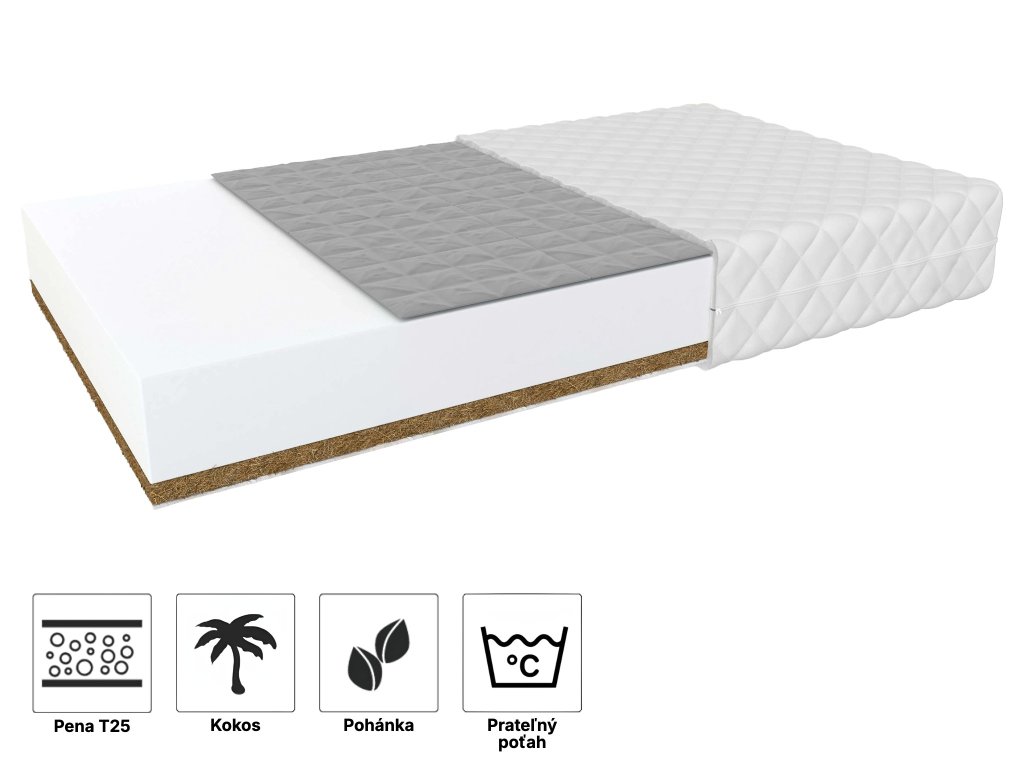 Materiálové zloženie: Poťah, Polyuretánová penas hustotou 25 kg/m3, Pohánka, Kokosová vrstva, Priedušná tkanina