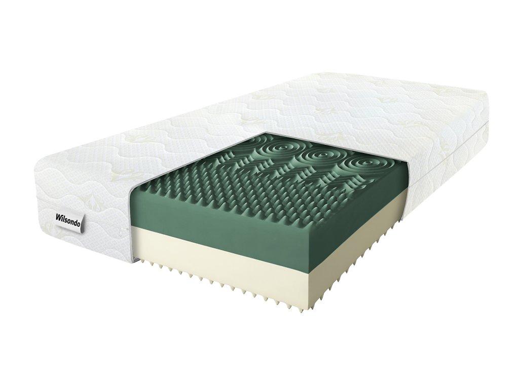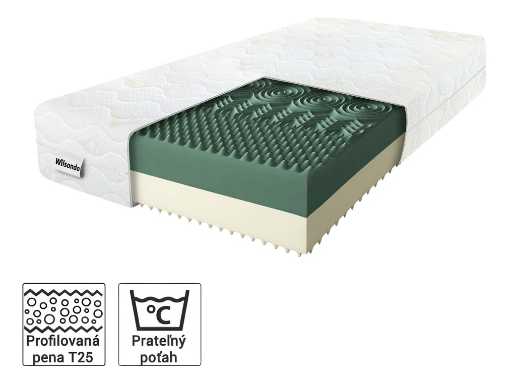 Materiál, vyrobený z kvalitnej 7-zónovej peny s profilovaným povrchom, podporuje lepšiu cirkuláciu krvi a uvoľnenie svalov počas odpočinku. Na základe telesnej teploty sa prispôsobuje tvaru vášho tela, čím zvyšuje komfort a kvalitu spánku. Rôznorodá tvrdosť v každej zóne poskytuje optimálnu podporu pre chrbticu a umožňuje prirodzenú polohu celého tela. Tento typ peny je tiež ideálny pre osoby s citlivosťou na alergény.