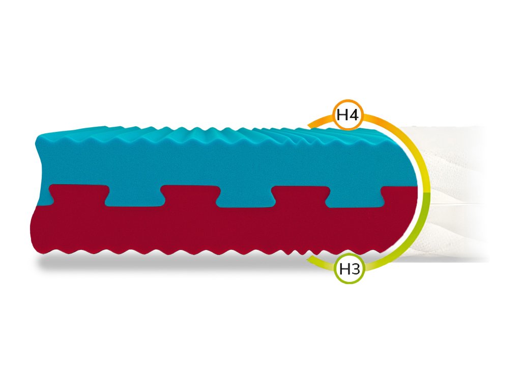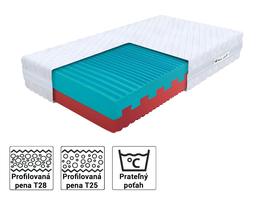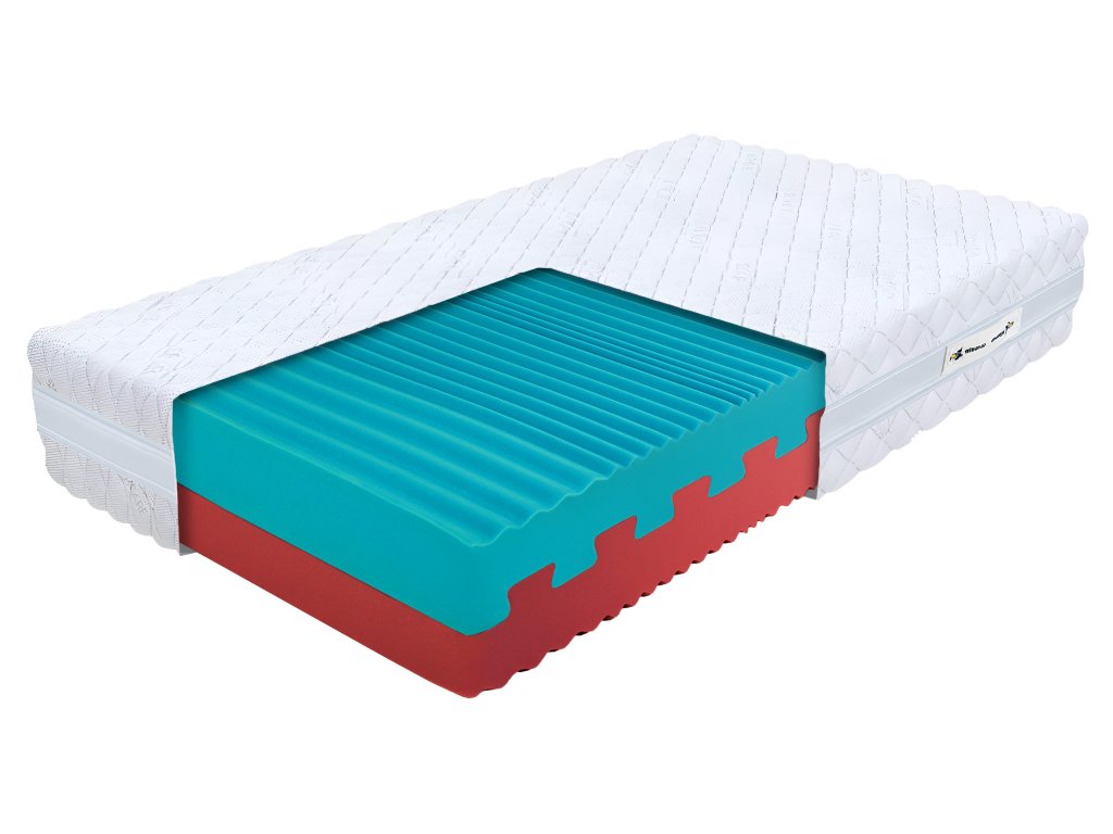 Materiál, vyrobený z kvalitnej 7-zónovej peny s profilovaným povrchom, podporuje lepšiu cirkuláciu krvi a uvoľnenie svalov počas odpočinku. Na základe telesnej teploty sa prispôsobuje tvaru vášho tela, čím zvyšuje komfort a kvalitu spánku. Rôznorodá tvrdosť v každej zóne poskytuje optimálnu podporu pre chrbticu a umožňuje prirodzenú polohu celého tela. Tento typ peny je tiež ideálny pre osoby s citlivosťou na alergény.