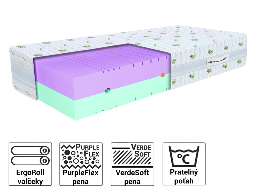 Materiálové zloženie: PurpleFlex pena, VerdeSoft pena, ErgoRoll valčeky, poťah Aloe Vera