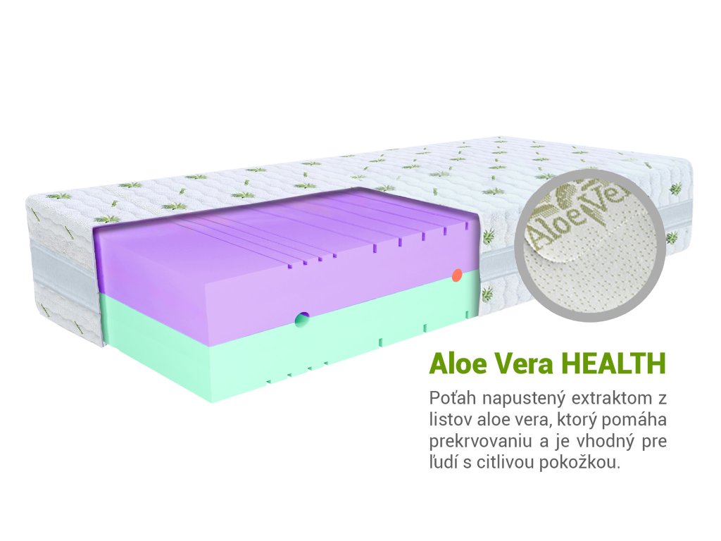 Povrch matraca je potiahnutý poťahom s výťažkami z Aloe Vera, ktorý prináša prirodzenú sviežosť a antibakteriálne vlastnosti. Tento poťah vytvára zdravé prostredie pre spánok a je vhodný aj pre alergikov.