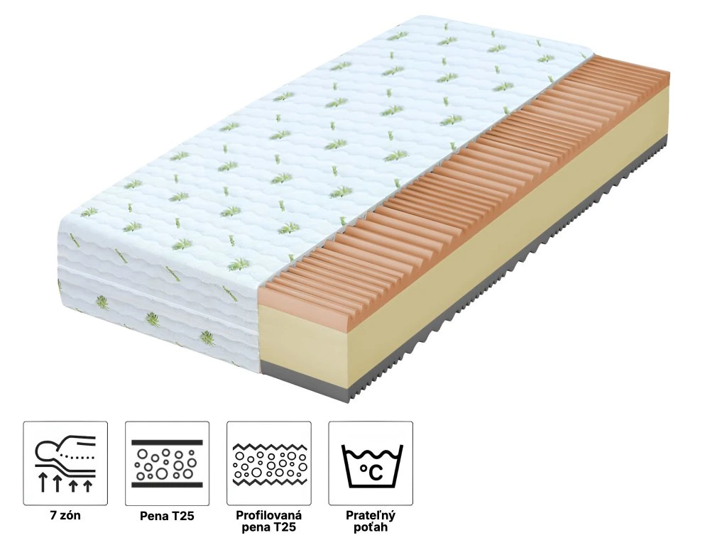 Materiál, vyrobený z kvalitnej 7-zónovej peny s profilovaným povrchom, podporuje lepšiu cirkuláciu krvi a uvoľnenie svalov počas odpočinku. Na základe telesnej teploty sa prispôsobuje tvaru vášho tela, čím zvyšuje komfort a kvalitu spánku. Rôznorodá tvrdosť v každej zóne poskytuje optimálnu podporu pre chrbticu a umožňuje prirodzenú polohu celého tela. Tento typ peny je tiež ideálny pre osoby s citlivosťou na alergény.