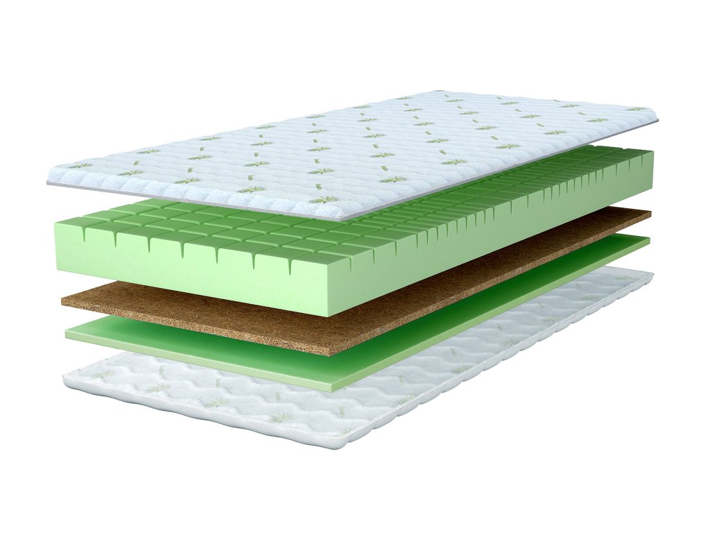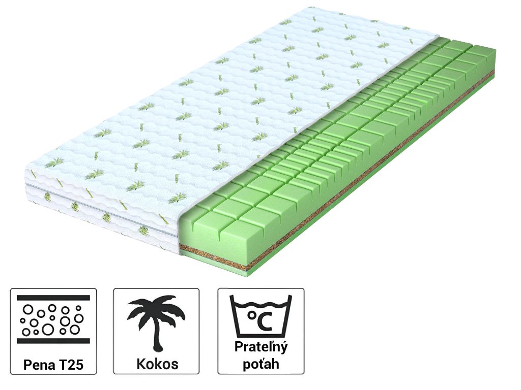 Materiálové zloženie: profilovaná polyuretánová pena T25, kokosová doska, prešívaný poťah Aloe Vera
