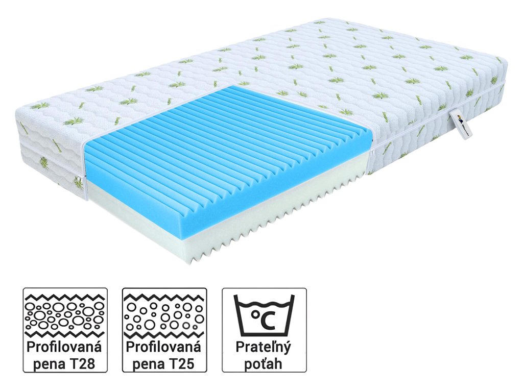 Materiál, vyrobený z kvalitnej 7-zónovej peny s profilovaným povrchom, podporuje lepšiu cirkuláciu krvi a uvoľnenie svalov počas odpočinku. Na základe telesnej teploty sa prispôsobuje tvaru vášho tela, čím zvyšuje komfort a kvalitu spánku. Rôznorodá tvrdosť v každej zóne poskytuje optimálnu podporu pre chrbticu a umožňuje prirodzenú polohu celého tela. Tento typ peny je tiež ideálny pre osoby s citlivosťou na alergény.