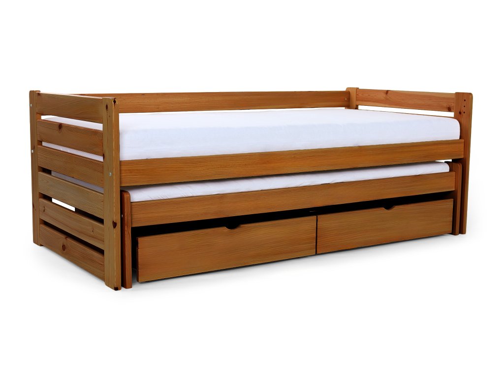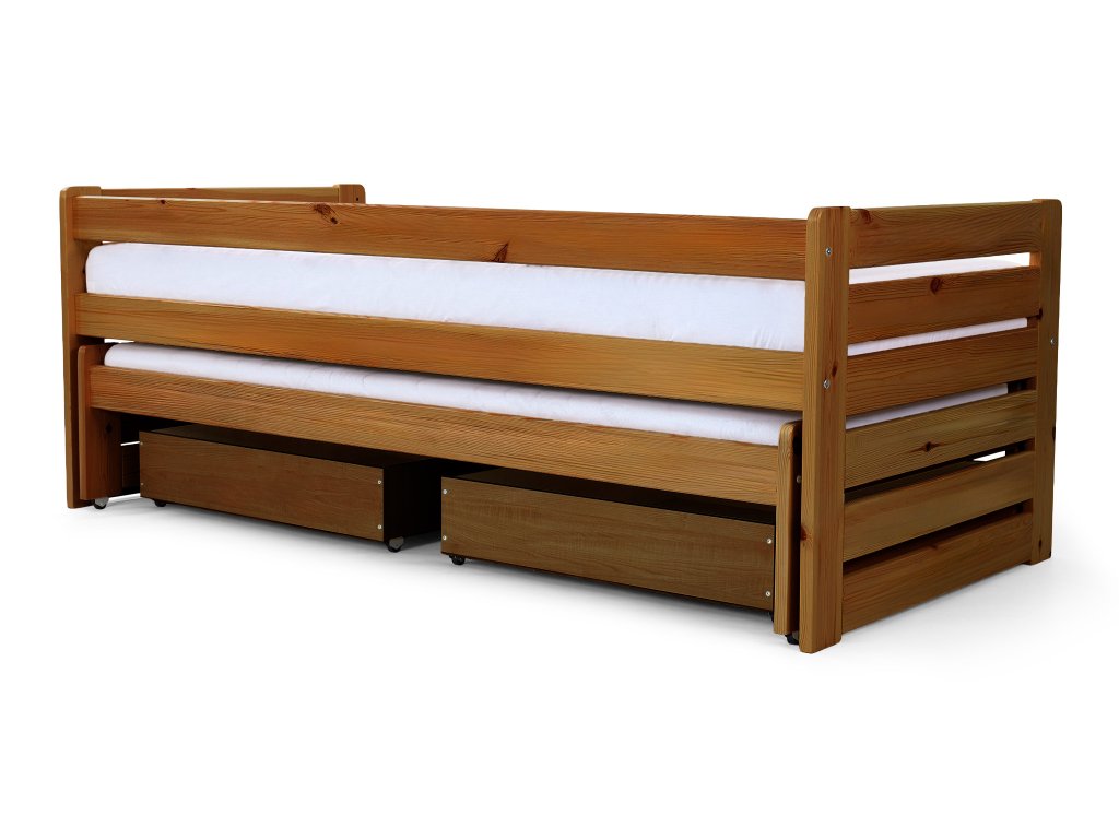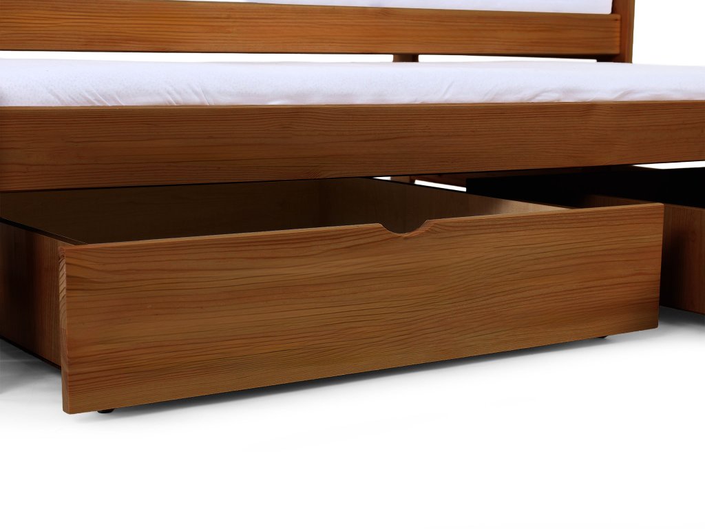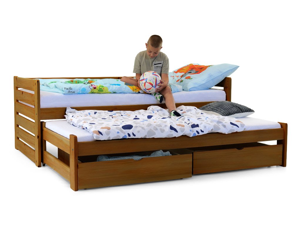 Posteľ Veronika 11 v klasickom rozmere 200x90 má praktickú výsuvnú prístelku a je vyrobená z borovicového masívu. Táto posteľ je vhodnou alternatívou v prípade, že ju potrebujete umiestniť do menšej izby a zasunutím prístelky, Vám tak zostane dostatok miesta na ďalšie aktivity. Posteľ má navyše úložný priestor v podobe dvoch zásuviek, čo určite využijete. Zásuvky sú na kolieskach, ktoré uľahšia ich manipuláciu a zároveň budú šetrné k Vašej podlahe. Posteľ je trikrát lakovaná bezfarebným, ekologicky nezávadným lakom. Posteľ je vhodnou voľbou pre každého, kto si potrpí na kvalitu, pretože je vyrobená z masívneho borovicového dreva, a preto Vám bude slúžiť dlhé roky. Úložné priestory nevypĺňajú celý priestor pod posteľou. Medzi nohami postele a úložnými boxami je väčšia medzera ako je znázornené na fotografii.