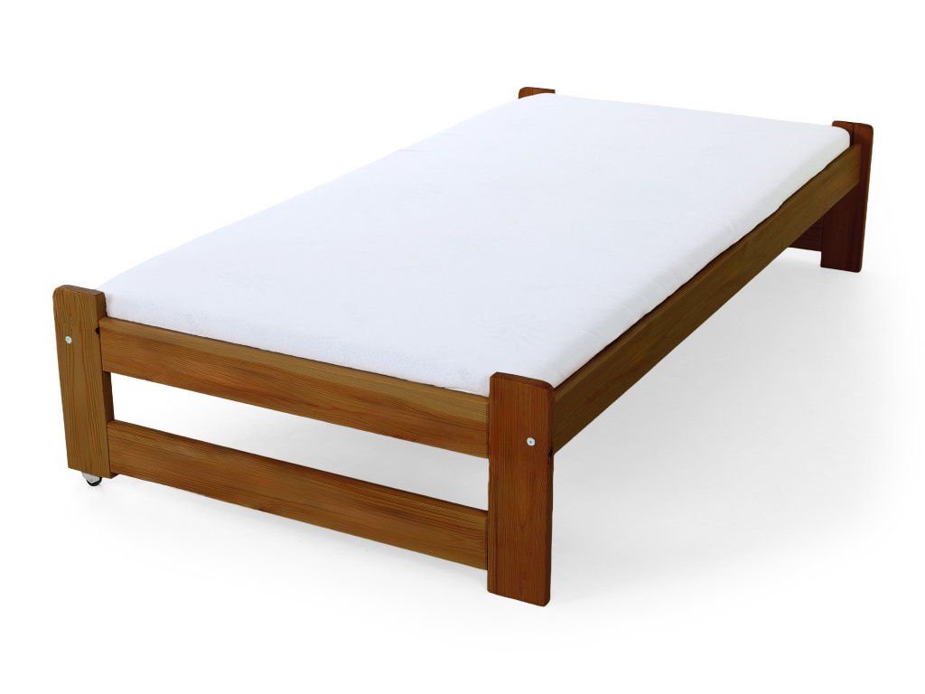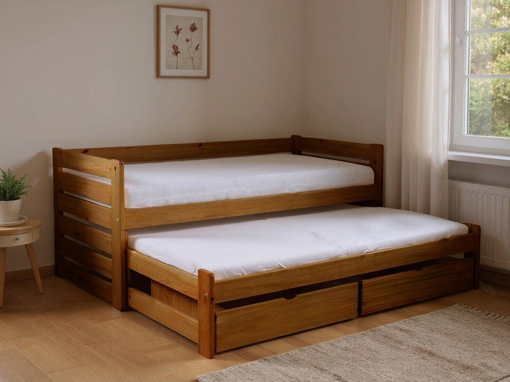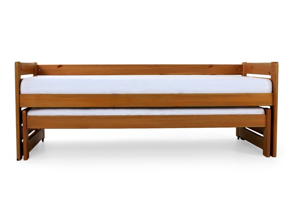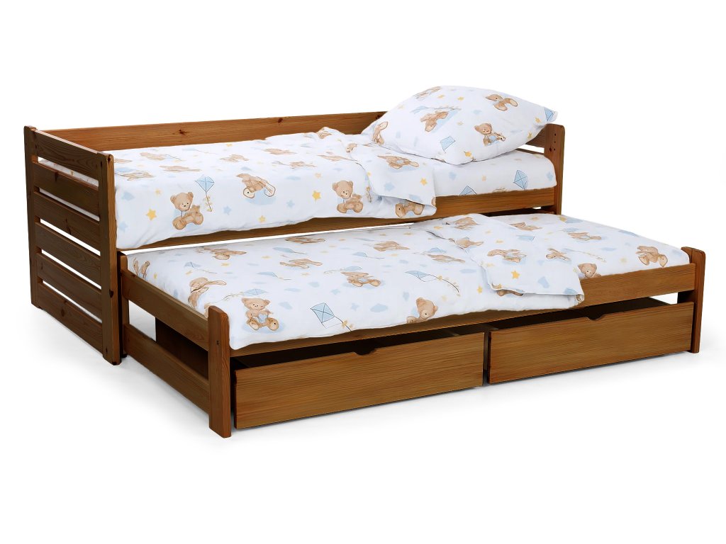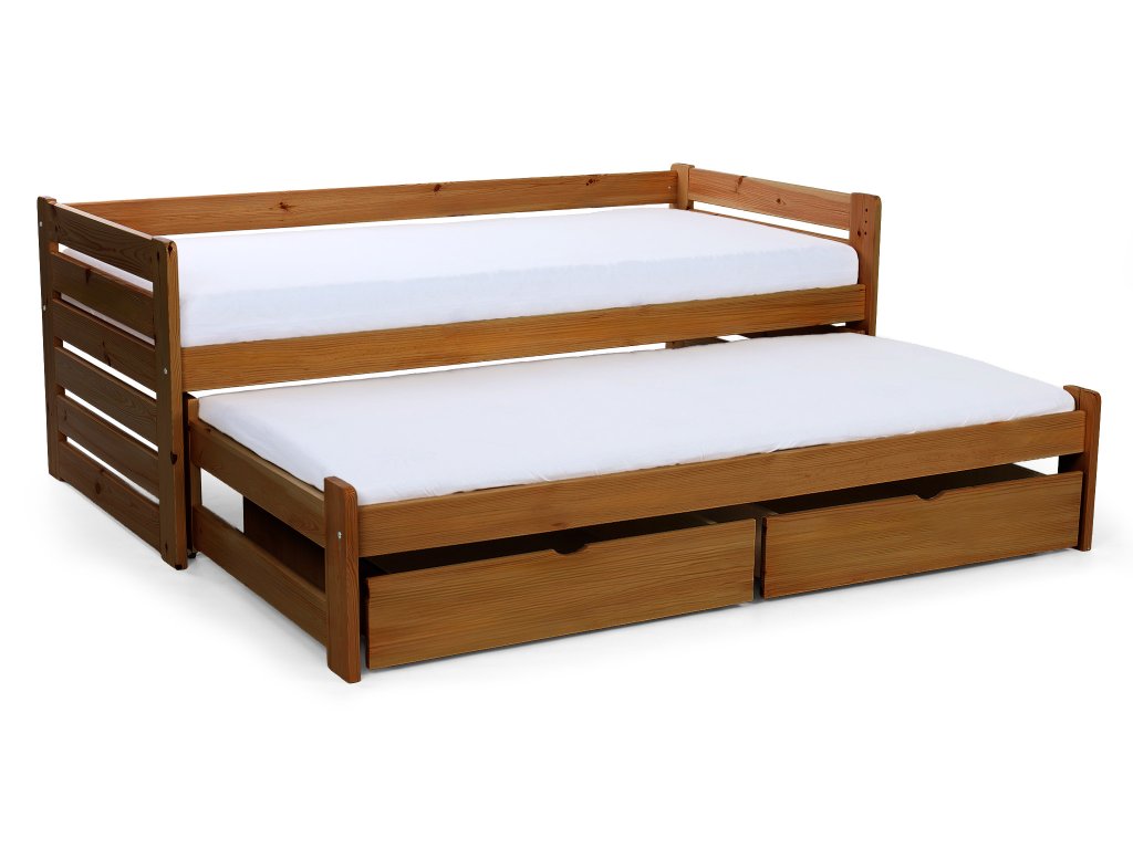 Posteľ Veronika 11 v klasickom rozmere 200x90 má praktickú výsuvnú prístelku a je vyrobená z borovicového masívu. Táto posteľ je vhodnou alternatívou v prípade, že ju potrebujete umiestniť do menšej izby a zasunutím prístelky, Vám tak zostane dostatok miesta na ďalšie aktivity. Posteľ má navyše úložný priestor v podobe dvoch zásuviek, čo určite využijete. Zásuvky sú na kolieskach, ktoré uľahšia ich manipuláciu a zároveň budú šetrné k Vašej podlahe. Posteľ je trikrát lakovaná bezfarebným, ekologicky nezávadným lakom. Posteľ je vhodnou voľbou pre každého, kto si potrpí na kvalitu, pretože je vyrobená z masívneho borovicového dreva, a preto Vám bude slúžiť dlhé roky. Úložné priestory nevypĺňajú celý priestor pod posteľou. Medzi nohami postele a úložnými boxami je väčšia medzera ako je znázornené na fotografii.