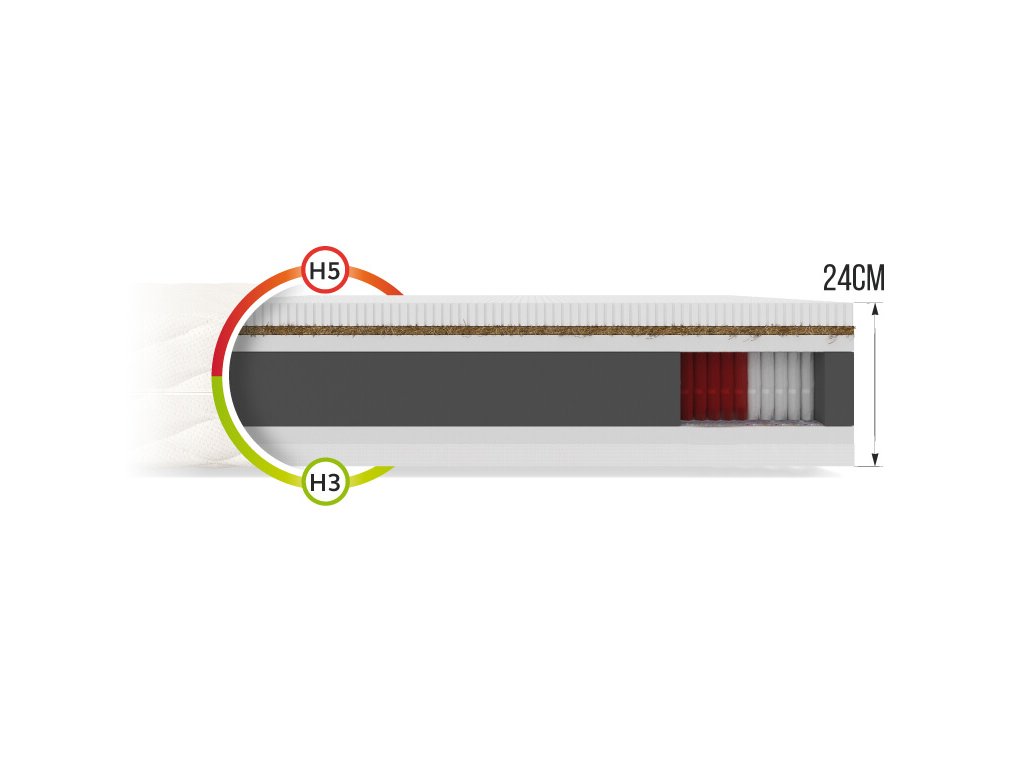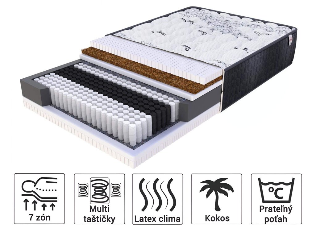 Materiálové zloženie: Filc, NanoHARD multi taštičkové pružiny, Polyuretánová pena, Kokosová vrstva, Latex, Poťah