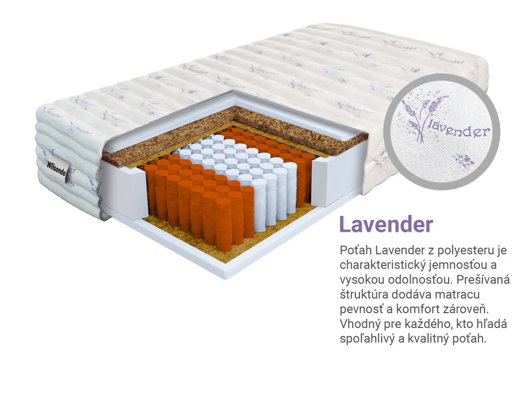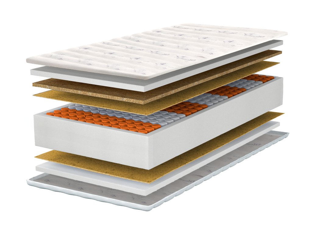 Materiálové zloženie: Filc, NanoHARD taštičkové pružiny, Polyuretánová PUR pena s hustotou 25 kg/m3, Poťah Lavender, Kokosová vrstva