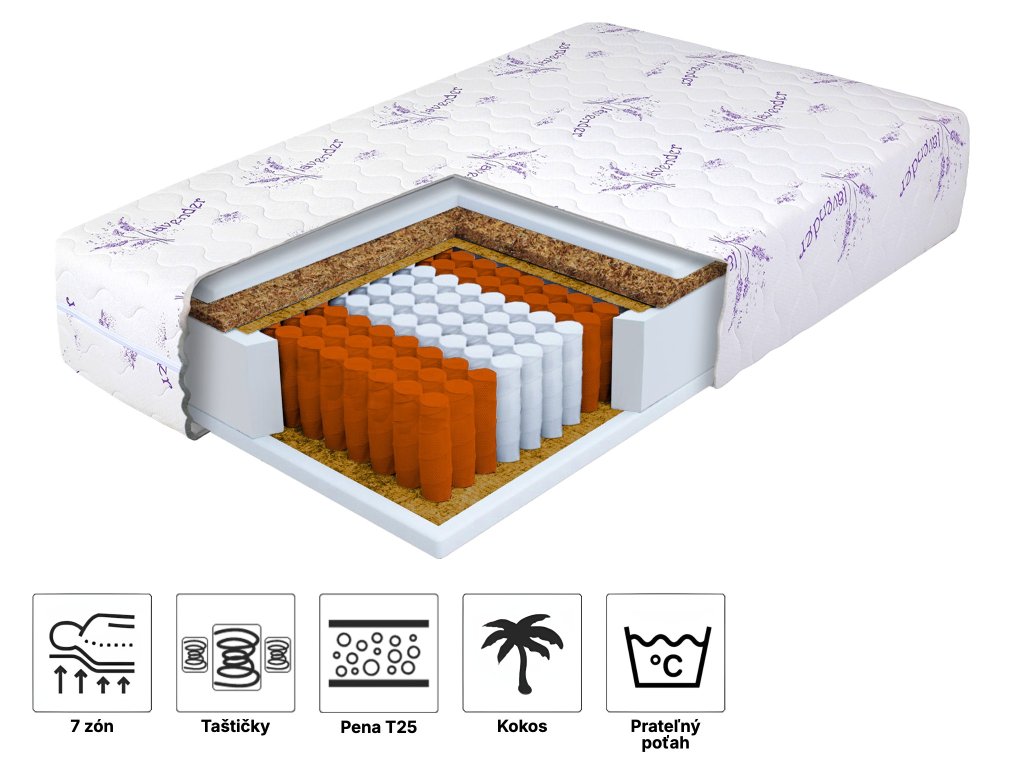 Materiálové zloženie: Filc, NanoHARD taštičkové pružiny, Polyuretánová PUR pena s hustotou 25 kg/m3, Poťah Lavender, Kokosová vrstva