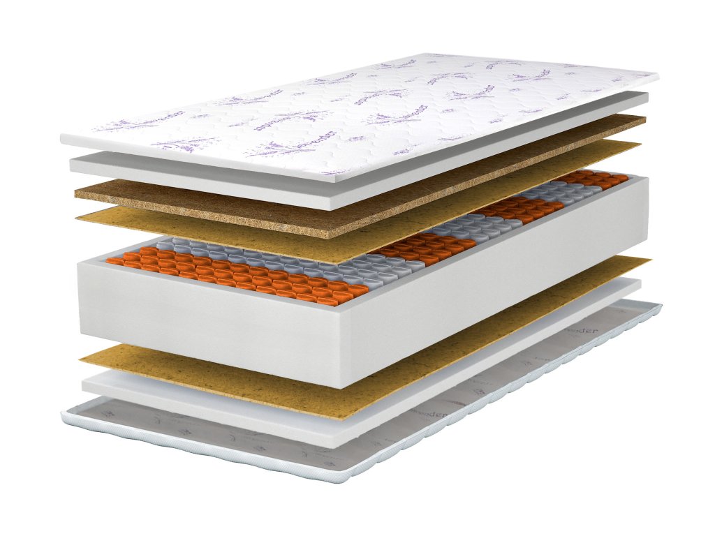 Materiálové zloženie: Filc, NanoHARD taštičkové pružiny, Polyuretánová PUR pena s hustotou 25 kg/m3, Poťah Lavender, Kokosová vrstva