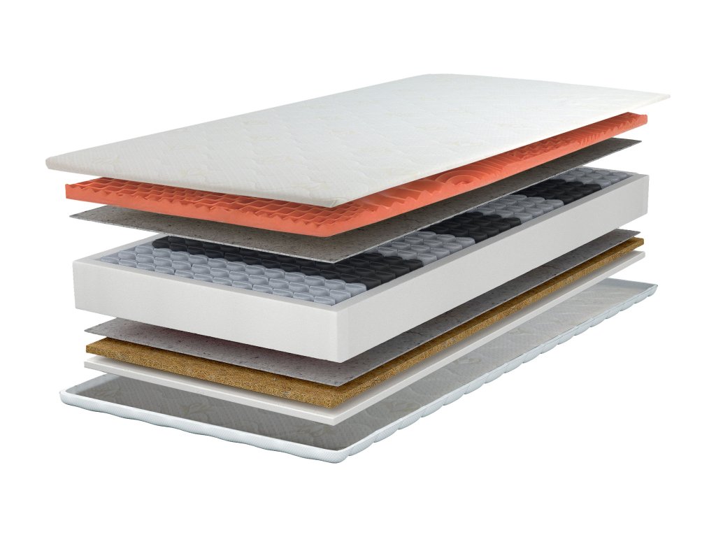 Materiálové zloženie: Filc, HARD taštičkové pružiny, Polyuretánová PUR pena s hustotou 25 kg/m3, Profilovaná pena T-25, Poťah, Kokosová vrstva