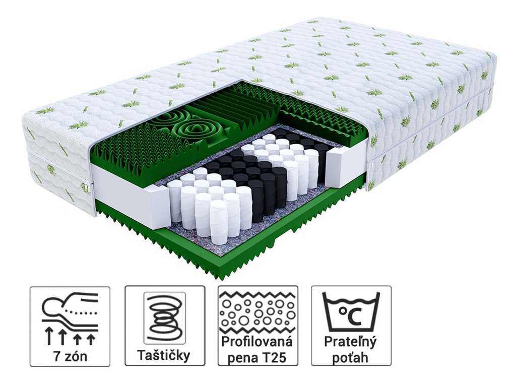 Materiál, vyrobený z kvalitnej 7-zónovej peny s profilovaným povrchom, podporuje lepšiu cirkuláciu krvi a uvoľnenie svalov počas odpočinku. Na základe telesnej teploty sa prispôsobuje tvaru vášho tela, čím zvyšuje komfort a kvalitu spánku. Rôznorodá tvrdosť v každej zóne poskytuje optimálnu podporu pre chrbticu a umožňuje prirodzenú polohu celého tela. Tento typ peny je tiež ideálny pre osoby s citlivosťou na alergény.