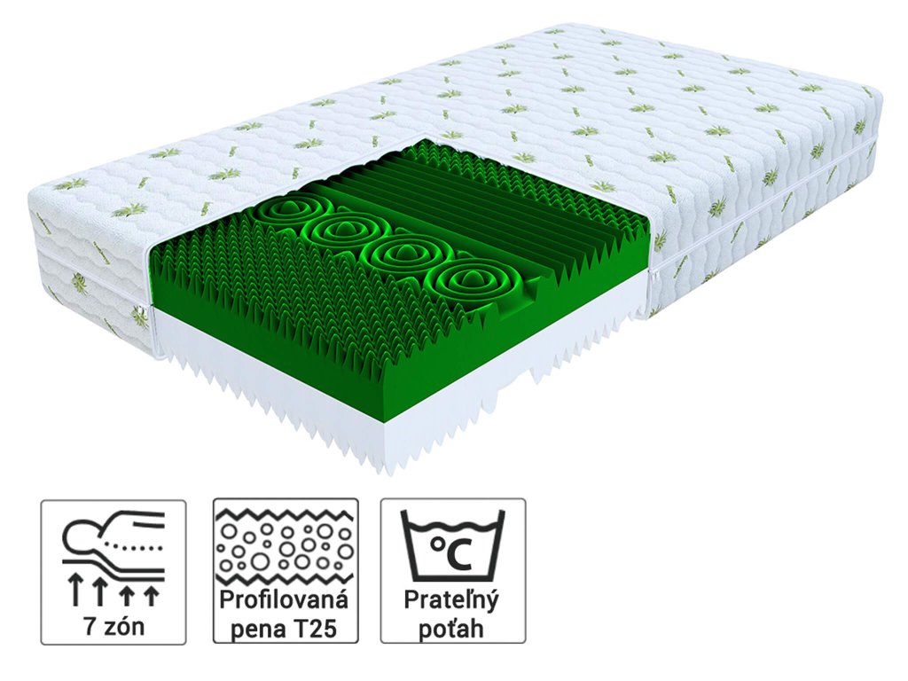 Materiál, vyrobený z kvalitnej 7-zónovej peny s profilovaným povrchom, podporuje lepšiu cirkuláciu krvi a uvoľnenie svalov počas odpočinku. Na základe telesnej teploty sa prispôsobuje tvaru vášho tela, čím zvyšuje komfort a kvalitu spánku. Rôznorodá tvrdosť v každej zóne poskytuje optimálnu podporu pre chrbticu a umožňuje prirodzenú polohu celého tela. Tento typ peny je tiež ideálny pre osoby s citlivosťou na alergény.