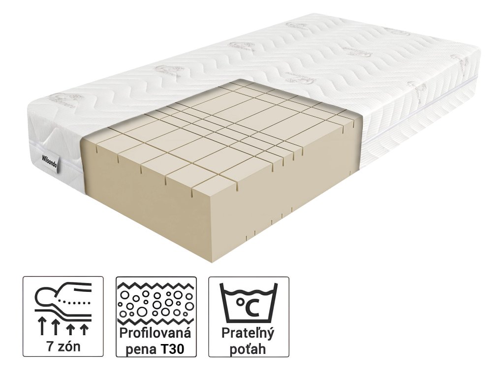 Pena s vysokou hustotou 30 kg/m³ vyniká zvýšenou odolnosťou voči opotrebovaniu a deformáciám, pričom si dlhodobo zachováva svoju pružnosť aj pri častom používaní. Vďaka svojej elastickej štruktúre sa efektívne prispôsobuje tvaru tela, čím zabezpečuje rovnomerné rozloženie hmotnosti a spoľahlivú oporu chrbtici – to prispieva k zníženiu rizika bolestí chrbta. Pena zároveň podporuje efektívne prúdenie vzduchu, čím bráni nadmernému zadržiavaniu vlhkosti a vzniku plesní či roztočov.